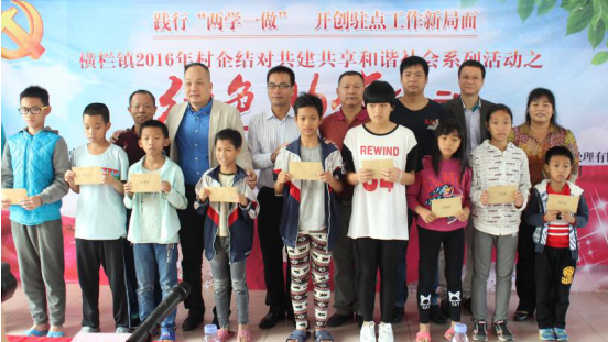 为着力践行“两学一做”,开创驻点工作新局面,11月13日,横栏镇贴边村开展村企结对共建共享和谐社会系列活动之“红色助学”行动,镇党委副书记林培华,镇党委委员林达光出席了活动,我会热心企业家镇商会会长、广东乐美达集团有限公司董事长何云峰,常务副会长、中山市永盛市场经营管理有限公司总经理吴耀棠,副会长、中山市横栏镇宏业建筑工程队总经理梁带胜,副会长、中山市乐美达金属表面处理有限公司总经理卢泽华以及中山市横栏镇星铭百货商店总经理王文枝代表参加了活动,活动由贴边村书记梁玉萍主持。