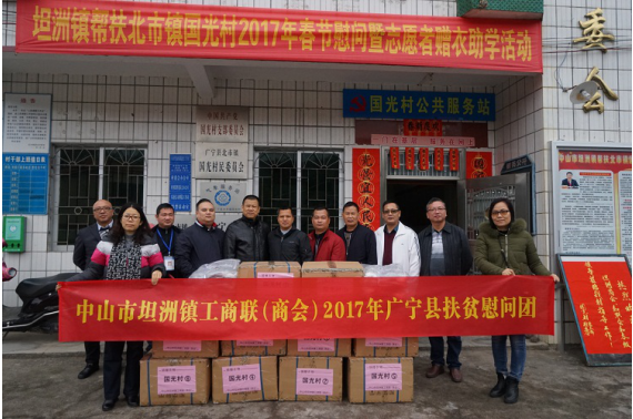 “细雨微风暗朝阳,爱心扶贫走他乡”,2017年2月24日在坦洲镇人大主席谢乐明带领下坦洲镇商会联合镇知联会共40人前往坦洲镇对口帮扶两镇四村:广宁县北市镇北市村、国光村和赤坑镇合成村、花山村开展赠衣助学送温暖活动。