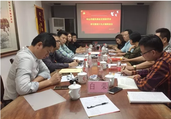 11月17日晚20:00,中山市韶关商会在商会会议室召开《关于认真学习贯彻党的十九大精神》的学习会。商会会长曾国锋,监事长顾晖,党支部书记蓝志坚、副会长朱代全、秘书长陈晓、商会党员刘远平、麦哲精、曾秀霞及商会建党对象白荣、温月莲、何伟初、曾宪忠等十二人参加了学习会。会议由商会党支部书记蓝志坚同志主持并做十九大会议精神宣讲。
