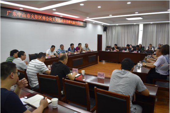 在大关县政府会议室两地代表召开主题为火炬区商会向大关县政府办电脑交接仪式暨中山市火炬开发区和翠亨新区结对帮扶大关县上高桥乡座谈会。会上,区工商联(商会)向大关县捐赠了电脑32台、复印机1台,并由阮锦活代表区工商联(商会)与大关县副县长罗章旭共同签署物资捐赠接收单。此外,会上还确定了上高桥乡、红旗村和大寨村结对帮扶项目。