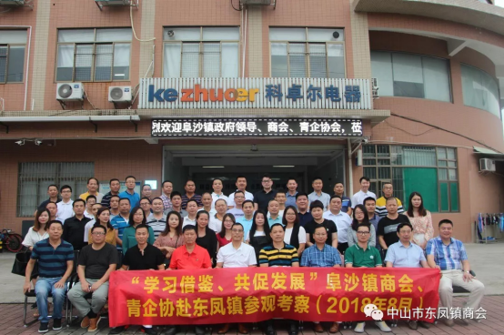 2018年8月31日,阜沙镇党委委员、副镇长梁庆明,商会会长胡泽洪率领阜沙镇工商联(商会)及青企60多名会员到我镇交流学习。阜沙工商联(商会)和青企一行先后参观了中山市科卓尔电器有限公司、广东伊莱特电器有限公司、中山市丽音电子有限公司。