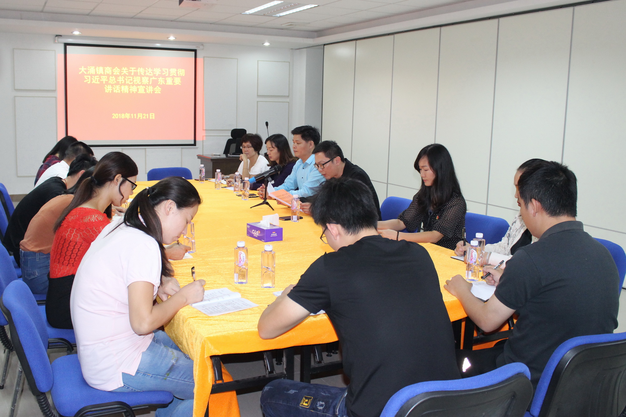 为进一步深入学习贯彻落实习近平总书记视察广东重要讲话精神。11月21日上午,按镇党委的工作部署,由镇党委委员欧阳凯代表镇党委莅临大涌镇商会党支部,向民营企业党员、入党积极分子宣讲习近平总书记视察广东重要精神和传达贯彻省、市、镇的学习要求。大涌镇商会、伟明轩家具厂、太兴家具有限公司、国城御宝家具厂、利兴强集团等党支部的党员、入党积极分子及商会专干共16人参加了学习。