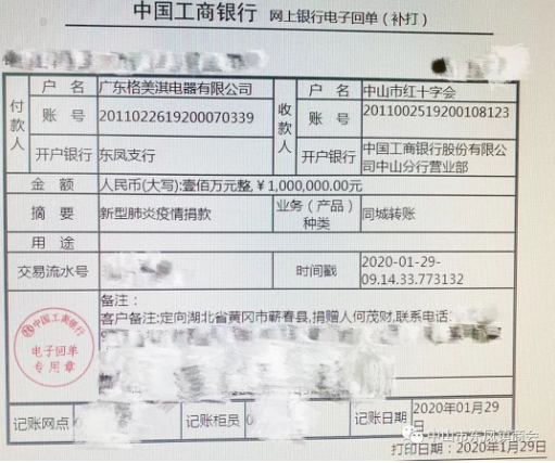在防控疫情急需社会各界支持时,东凤镇工商联(商会)会长何茂财(广东格美淇电器有限公司)率先向疫情地区捐赠100万元支援疫区;常务副会长黄蕴华捐赠5万元支援“新冠肺炎疫情”湖北省黄冈市蕲春县。
