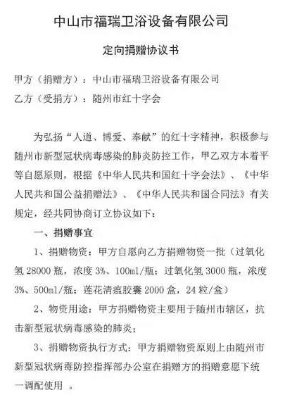 中山市湖北随州商会高度关注家乡随州疫情防控情况,关心乡亲们的生命安全。会长单位中山市福瑞卫浴设备有限公司总经理张海锋动员所有关系,四处求购医用物资。2月6日向随州市红十字会捐赠物资一批:浓度为3%的过氧化氢100ML/瓶28000瓶、500ML/瓶3000瓶;24粒装莲花清瘟胶囊2000盒,用于随州市辖区抗击新型冠状病毒感染的肺炎。名誉会长单位中山太力集团董事长石正兵向随州市中心医院捐赠防控物资一批,市场价值20万余元。2月5日随州市中心医院已接收捐赠物资。代理理事单位中山市灿欣电器有制品限公司总经理邹传雷向随州市曾都区府河镇财政所捐款3万元,用于府河镇疫情救灾。