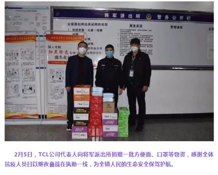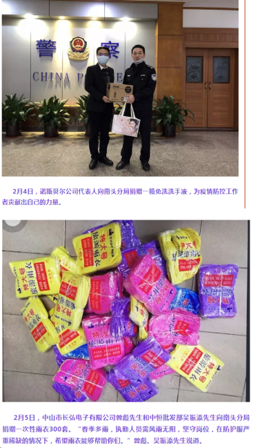 南头镇工商联(商会)的各爱心企业和热心群众纷纷向南头公安捐赠防疫物资,对疫情防控特殊时期坚守在抗疫一线的公安民警表示感谢和热心鼓励。包括:诺斯贝尔公司代表人向南头分局捐赠一箱免洗洗手液;中山市长弘电子有限公司曾彪先生和中恒批发部吴振添先生向南头分局捐赠一次性雨衣300套;TCL公司代表人向将军派出所捐赠一批方便面、口罩等物资。