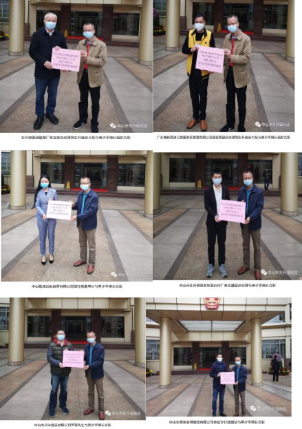 东升镇工商联(商会)的爱心企业继续向东升镇政府捐赠,定向用于东升镇新冠肺炎防控。包括:嘉强吸塑厂及广东粤映高速公路服务区管理有限公司各捐出3000元,中山隆成启航商贸有限公司捐赠10000元,中山市东升镇讯发包装彩印厂捐赠10400元,中山市吕宋食品有限公司捐赠3000元,中山市澳美家具制造有限公司捐赠5000元。