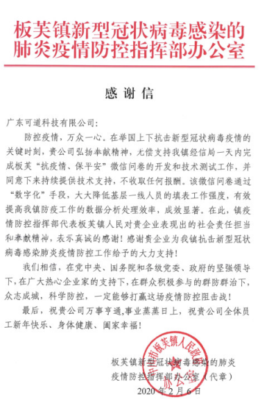 板芙镇新冠病毒感染肺炎疫情防控指挥部向市互联网应用创新协会会员单位广东可道科技有限公司来感谢信