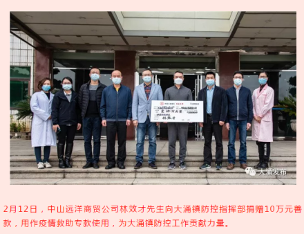 中山远洋商贸公司林效才先生向大涌镇防控指挥部捐赠10万元善款,用于大涌镇疫情救助专款。