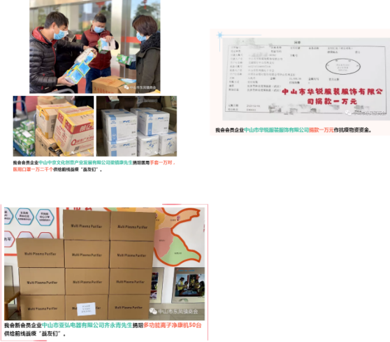 东凤镇工商联(商会)积极发动会员企业支持当地疫情防控工作。会员企业中山中京文化创意产业发展有限公司梁镇康先生捐赠医用手套一万对,医用口罩一万二千个供给前线战疫“战友们”。会员企业中山市亚弘电器有限公司齐永青先生捐赠多功能离子净康机50台供给前线战疫“战友们”。会会员企业中山市华锐服装服饰有限公司捐款10000元作抗疫物资资金。