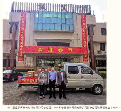 板芙镇工商联(商会)理事单位、中山三盛家居装饰材料有限公司总经理、中山科宁特清洁用品有限公司副总经理陈轩福先生,中山科宁特清洁用品有限公司总经理张俊豪先生向板芙镇政府捐赠爱心防疫用品