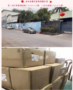 黄圃镇工商联(商会)副会长单位中山市继文家具有限公司继续向黄圃镇捐赠15320个口罩,两批合共捐赠41320个口罩(价值13万元)