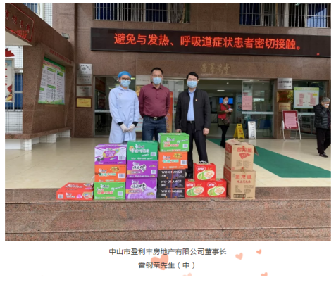 板芙镇工商联(商会)副会长中山市盈利丰房地产有限公司董事长雷钢荣慰问板芙医院一线抗疫医护人员,捐赠方便面110包,八宝粥100瓶,新鲜水果3盒(价值约900元)。