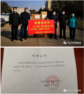 中山市河南商会执行会长——广东凤凰高科集团创始人余飞向河南省信阳市捐赠一批防疫医疗物资(从日本采购的2500只N95—1400型口罩和5000只一次性医用口罩(价值7.78万元)。会员企业鸿宝科技股份有限公司总经理杜姬芳向家乡河南捐赠6000个口罩,并向中山的基金会捐赠善款1万元。