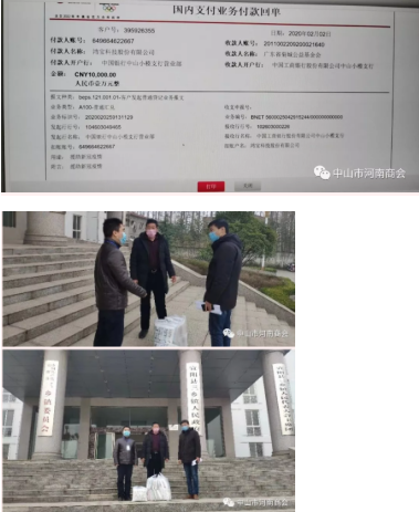 会员企业鸿宝科技股份有限公司总经理杜姬芳向家乡河南捐赠6000个口罩,并向中山的基金会捐赠善款1万元