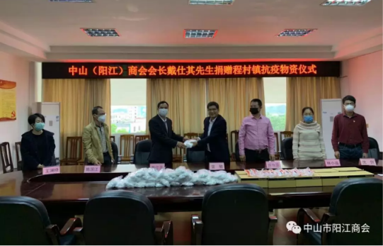 中山市阳江商会会长单位中山市岐安市政工程有限公司董事长戴仕其及秘书长陈协双从多方渠道购买了一批口罩、84消毒水、护目镜等(价值约2万元)捐赠给阳江市阳西县程村镇政府