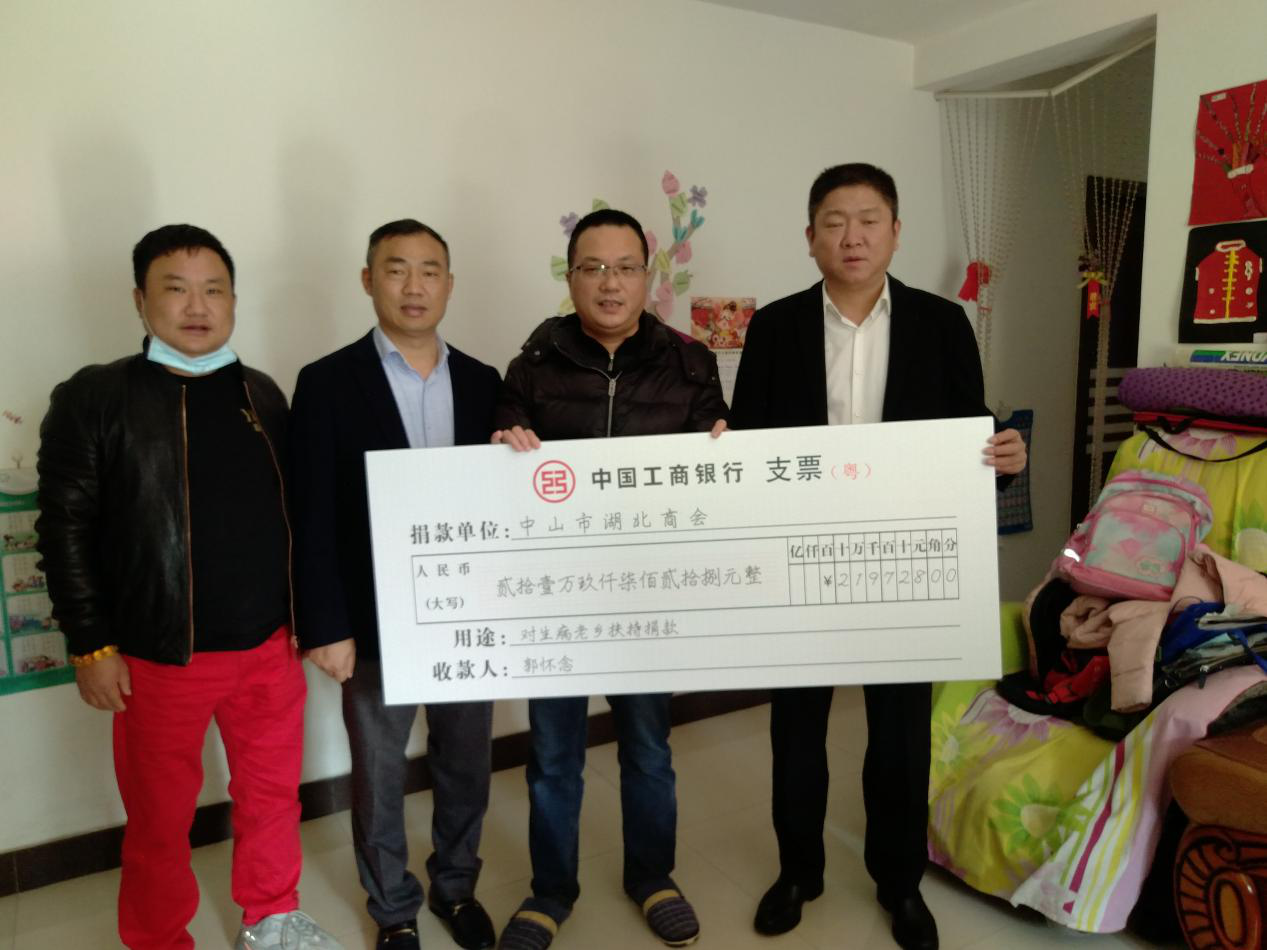 当天上午,该商会会长周新国一行来到位于火炬开发区健康花城小区,探望刚出院不久的该商会会员郭怀念,详细了解他出院后的身体恢复情况和目前家庭经济生活状况,并把该商会会员和湖北乡贤共同募集救助他治病的21.97万元善款支票转交给他。