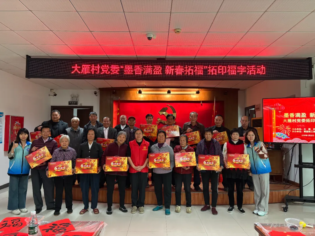 商会联合大雁村、副会长单位中山市黄圃银华腊味有限公司开展“墨香满盈 新春拓福”拓印福字活动,捐赠腊味礼盒35份共约7000元支持本次活动。会员单位广东根哥美食餐饮服务有限公司赞助2000元,对参加老人体检人员购买礼品。
