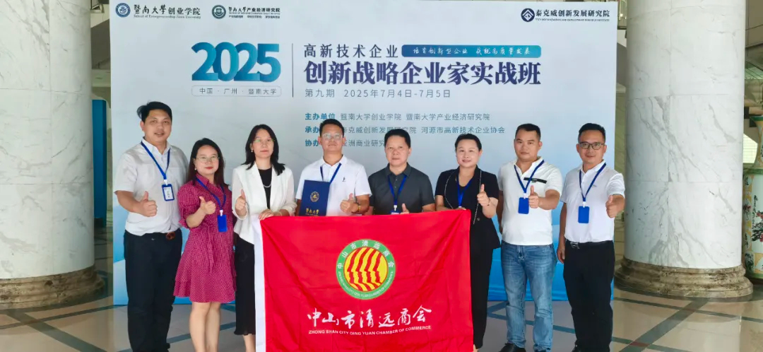 在当前市场竞争日趋激烈、不确定性因素日益凸显的背景下,创新已成为企业突破发展瓶颈、实现稳健经营的关键路径。为切实提升会员企业创新能力、把握发展机遇,7月4日至5日,清远商会会长刘胜长,理事长朱少琴,执行会长刘丽玲、黄尚飞,常务副会长李文志,副会长兼秘书长朱光锡,副会长李丽萍,理事黄明金等商会领导层成员,赴暨南大学参加了“高新技术企业创新战略企业家实战班(第九期)”培训。