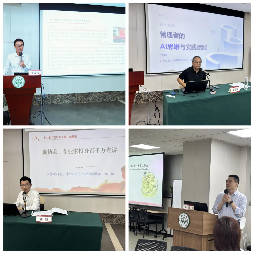 培训班邀请了中山大学法学院教授董淳锷专题解读《民营经济促进法》,为学员们厘清法律框架,强化合规经营意识;中山大学岭南学院教授陈刚团队共创主题工作坊以提升商协会服务职能为主题,激发团队创新思维,促进办会经验交流;广东工业大学管理学院教授刘洪伟以“管理者的AI思维”课程打开数智化转型新视野,探讨人工智能在商协会管理中的实践应用。