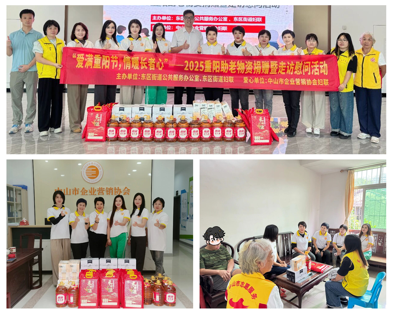 中山市企业营销协会主动发起爱心动员,组织会员企业捐资捐物,并组成慰问团深入社区开展走访慰问,为社区长者送去米、油、纸巾、牛奶在内生活与营养物资,与社区老人亲切交流,倾听需求,传递尊重与关爱,展现了商会服务群众、回馈社会的宗旨。