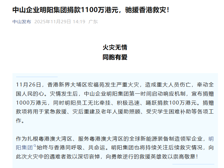 明阳集团 第一时间启动响应机制,宣布捐赠1000万港元,同时明阳员工无比牵挂、积极迅速、踊跃捐款100万港元。捐赠款项将用于紧急救援、灾后重建及老年人援助照顾、受灾学生困难补助等各项工作。