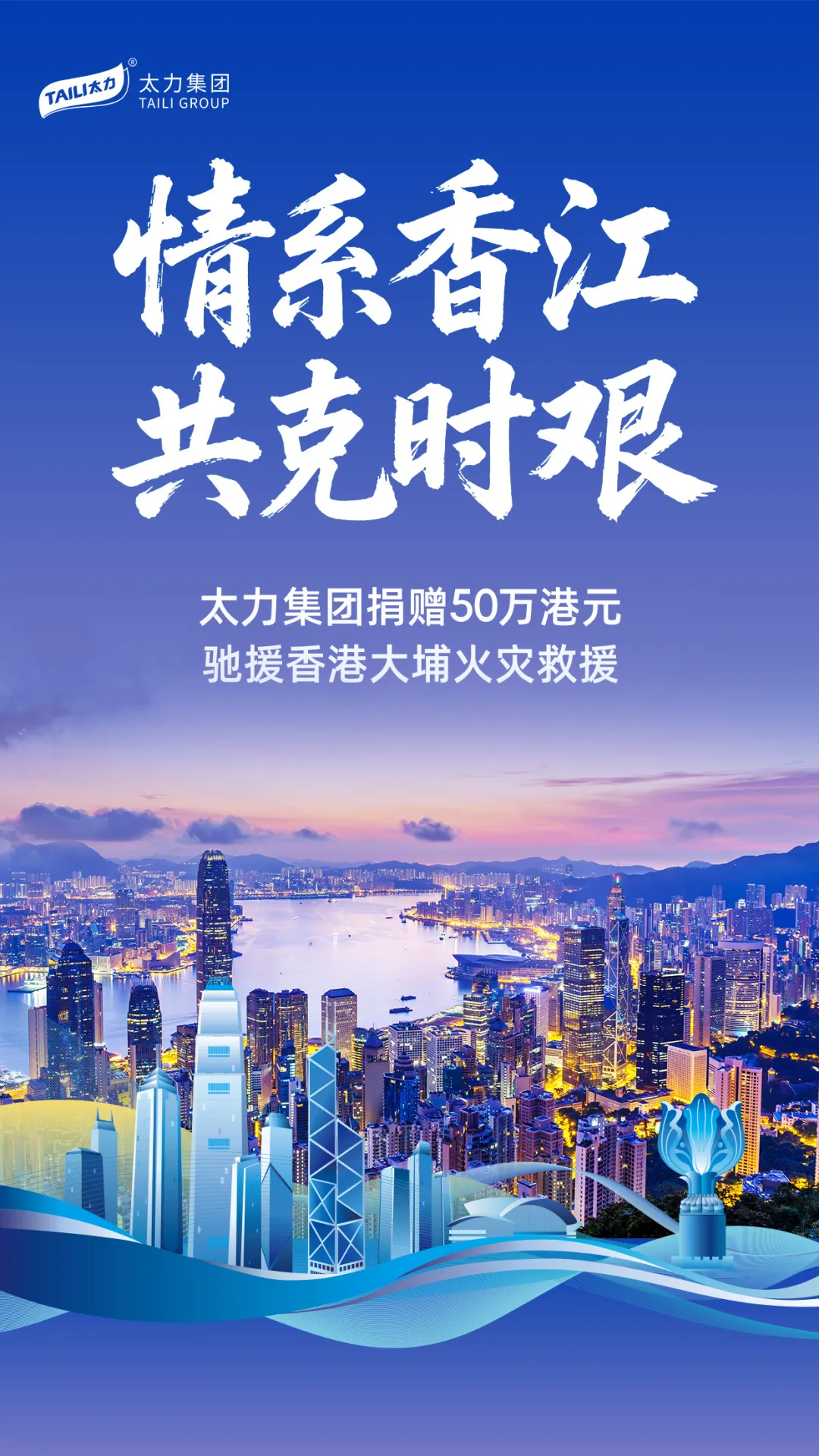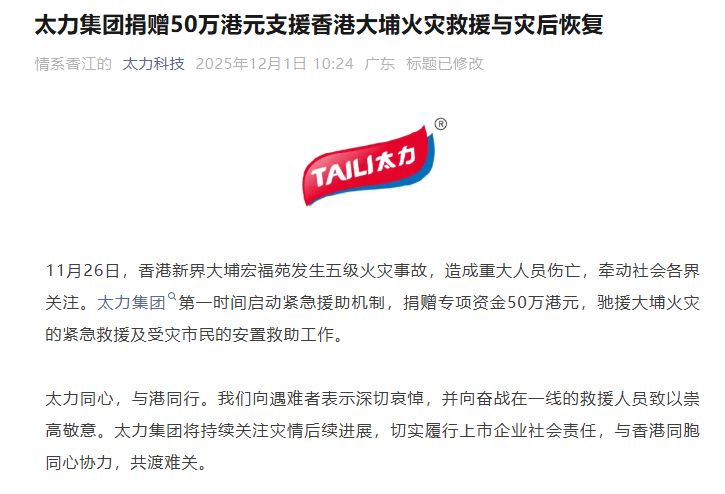 太力集团 第一时间启动紧急援助机制,捐赠专项资金50万港元,驰援大埔火灾的紧急救援及受灾市民的安置救助工作。太力同心,与港同行。太力集团将持续关注灾情后续进展,切实履行上市企业社会责任,与香港同胞同心协力,共渡难关。