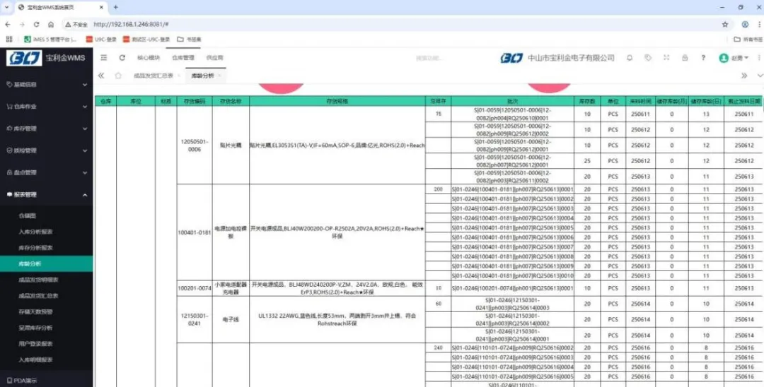 二是建立电子元器件特规管理的数字仓储体系。围绕仓储管理中账实不符、作业依赖纸质单据、先进先出执行困难等痛点,宝利金电子搭建WMS实现仓储数字化管理,并集成ERP打通供需数据。通过规范物料标签体系和绑定潮湿敏感器件(MSD)等级等要求,实现来料扫码自动触发IQC流程,并依据电源产品工艺需求实行差异化储运策略。推行移动端扫码收发料,结合FIFO策略及库存动态预警,加强物料从入库、赋码、拣配到SMT上料的全链路管控,避免批次混料与静电损伤,保障产品可靠性和成本精准控制。