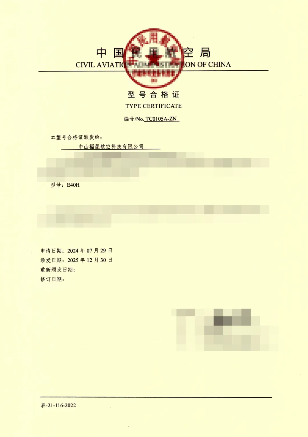 2024年7月31日,中国民用航空中南地区管理局正式受理福昆航空E40H型号合格证(TC)申请,同年8月组建审查组,12月开展E40H型号审查首次会议。2025年7月进行制造符合性检查并在局方目击下开展符合性验证试验,于12月完成最终评审,仅历时1年5个月,于2025年12月30日E40H正式获颁TC证。