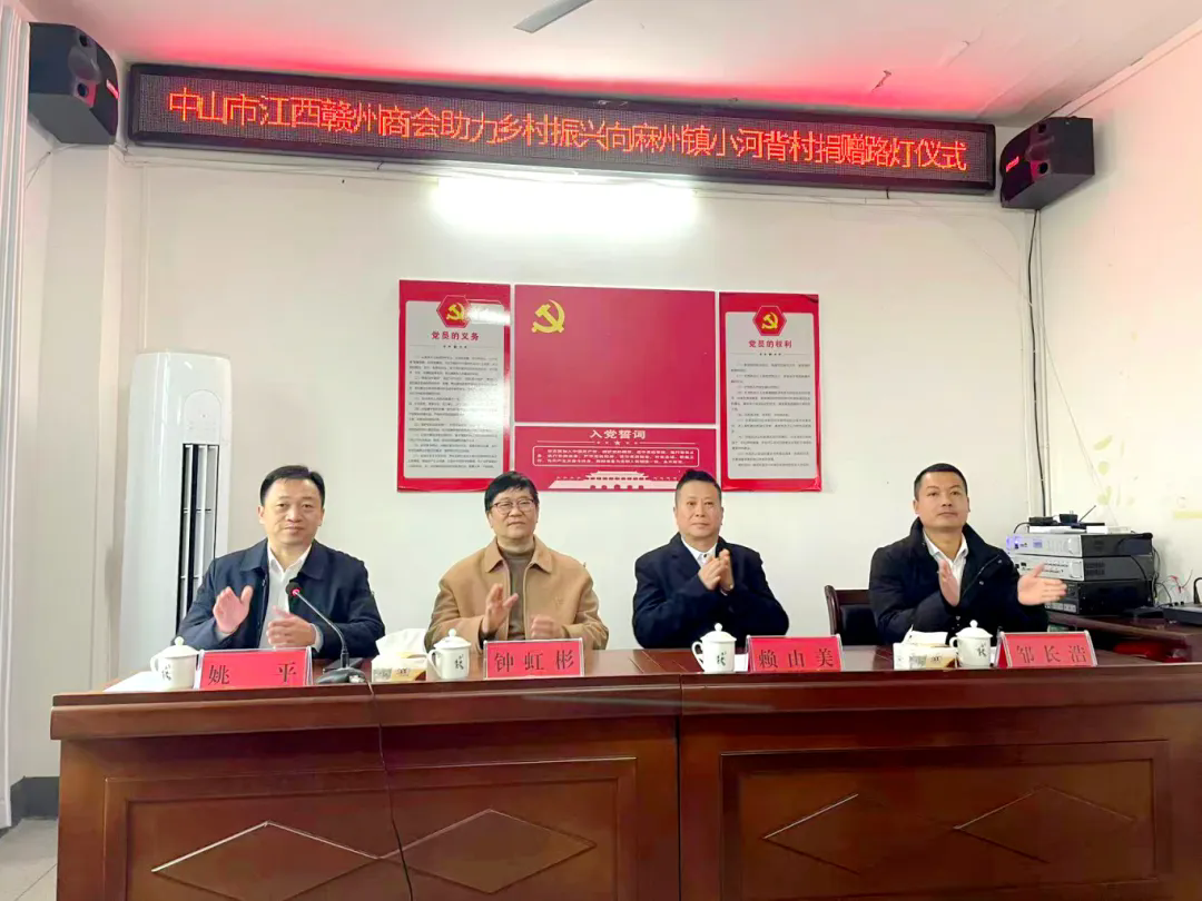 会昌县人大常委会副主任钟虹彬、麻州镇党委书记姚平、小河背村党支部书记邹长浩、中山市江西赣州商会会长赖由美等出席捐赠仪式,见证公益行动。50盏太阳能路灯由赖由美会长、黄春华常务副会长、吴伟圣理事个人出资,以商会名义捐赠,彰显企业家社会责任,为会员树立榜样。