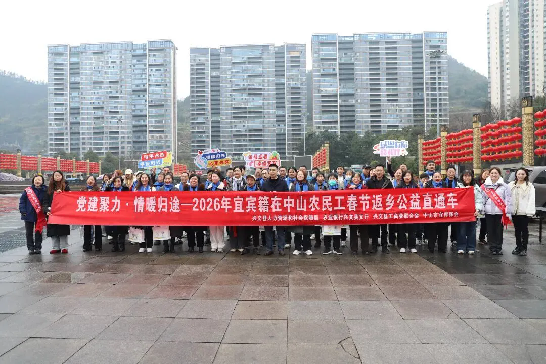 春节前夕,中山市小榄车站启动“党建聚力·情暖归途”2026年春节返乡公益直通车活动。活动由宜宾市人社局和中山市人社局指导,中山市宜宾商会党支部主办,专车跨越1300多公里护送50名在中山务工的宜宾籍老乡返乡,以实际行动诠释新时代社会组织的责任担当,传递两地党委政府对广大务工人员的深切关怀,这也是中山市宜宾商会党支部连续七年开展公益返乡活动。