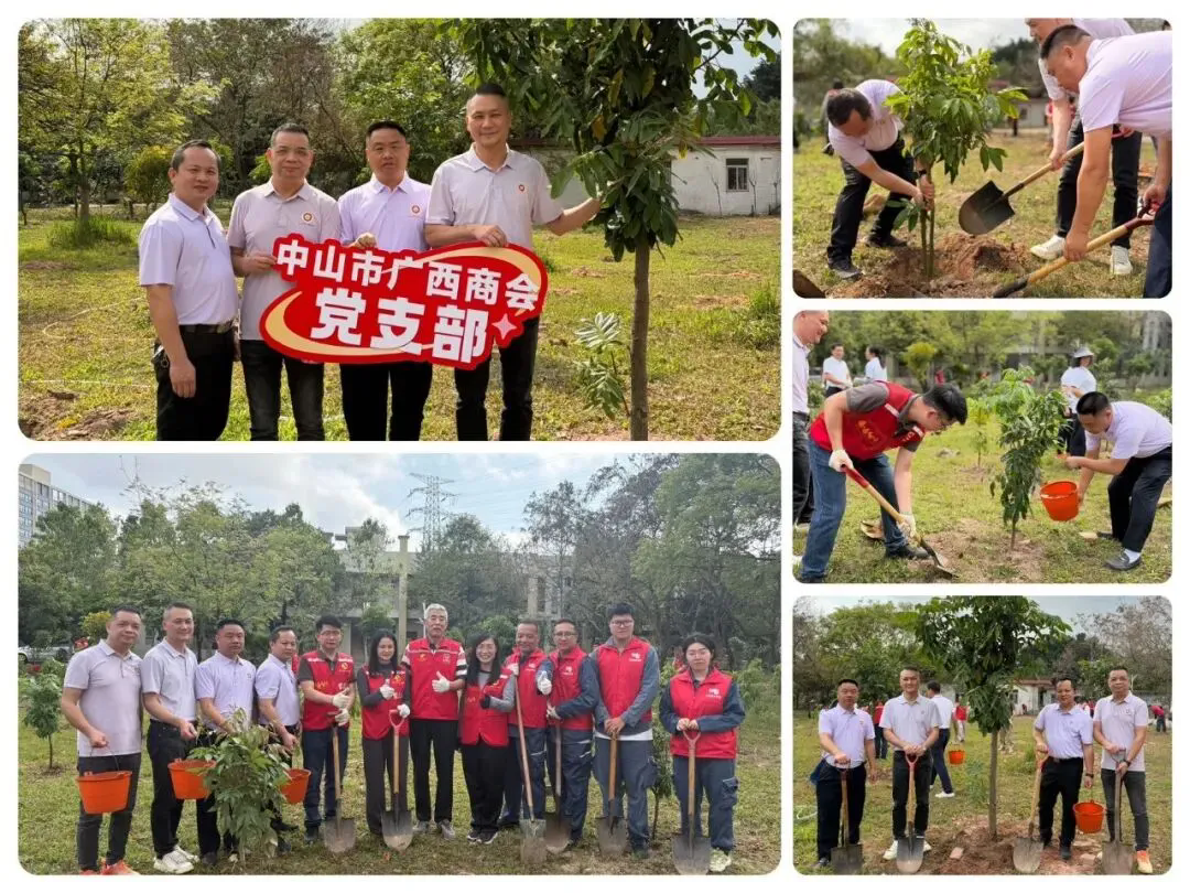 党旗飘扬映初心,植树增绿践使命。中山市广西商会党支部参加港口镇新港社区举办的“植新绿 开新局 谱新篇”义务植树活动,助力绿美广东生态建设,以实际行动为家园添绿增彩。港口镇党委、政府相关领导,相关社会团体、党员、志愿者及企业家代表等100余人参加活动,同心共植新绿。活动现场,大家分工协作、默契配合,挥锹铲土、扶苗培土、浇水灌溉,有序栽种细叶紫薇、桂味荔枝、石硖龙眼等各类苗木100余株。本次活动以植树和党建为引领,领导带头、各界参与,营造爱绿护绿氛围,为家园添绿、生态赋能,并深化社区与商会联动,凝聚共建绿色家园合力。